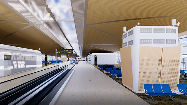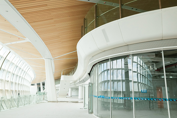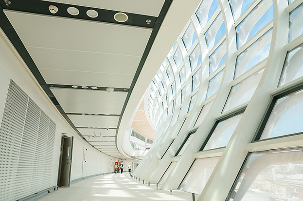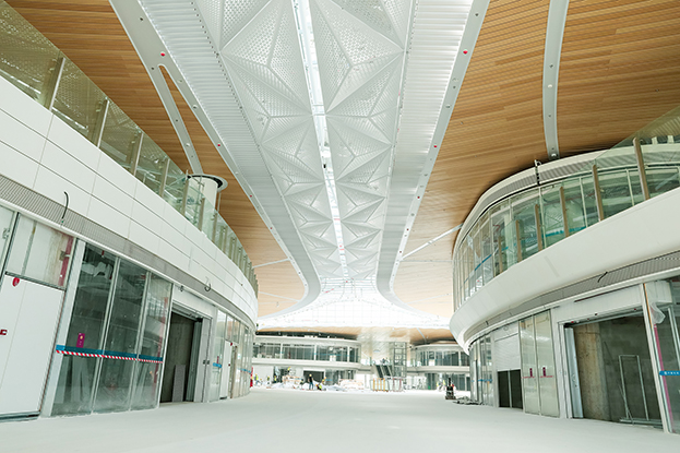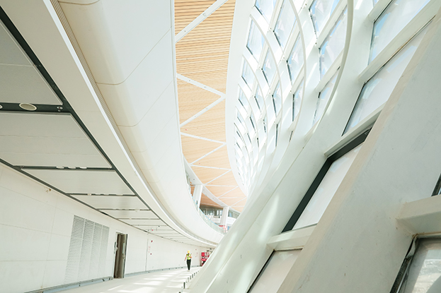 深圳機(jī)場衛(wèi)星廳建筑面積23萬多平方米,由中央、東南、東北、西南和西北五個(gè)指廊組成,分為地上四層、地下一層。作為唯一參與精裝修的民營企業(yè),中裝建設(shè)主要負(fù)責(zé)深圳機(jī)場衛(wèi)星廳2-3層西南、西北指廊,西雙子星廣場的精裝修工程。