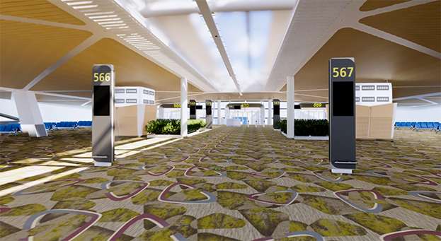 衛(wèi)星廳雖然是T3航站樓國內(nèi)候機(jī)指廊的延伸,但也需要體現(xiàn)其內(nèi)在價(jià)值和特色。與T3航站樓相比,衛(wèi)星廳建筑規(guī)模和體量都小。衛(wèi)星廳以實(shí)用性和旅客體驗(yàn)為特點(diǎn),因此更適合采用木色等天然材質(zhì)的作為空間主要色調(diào),積極打造深圳機(jī)場衛(wèi)星廳為一個(gè)明亮、溫馨、具有自然質(zhì)感、親切的航站樓。鋪地主要采用整體無縫磨石地坪、高端無機(jī)人造石、地毯打造,鋪地根據(jù)建筑功能,整體無縫磨石地坪主要分布三層及二層中央出港區(qū)域,地毯主要分布在三層各個(gè)指廊候機(jī)區(qū)域。其余區(qū)域鋪地為高端無機(jī)人造石。